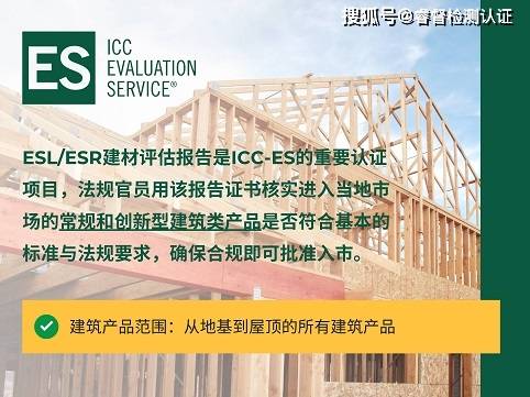 ESR/ESL建材评估报告是ICC-ES的重要认证项目,法规官员用该报告证书核实进入当地市场的常规和创新型建筑类产品是否符合基本的标准与法规要求,只要产品被确认符合相应法规,即可获得市场准入许可。